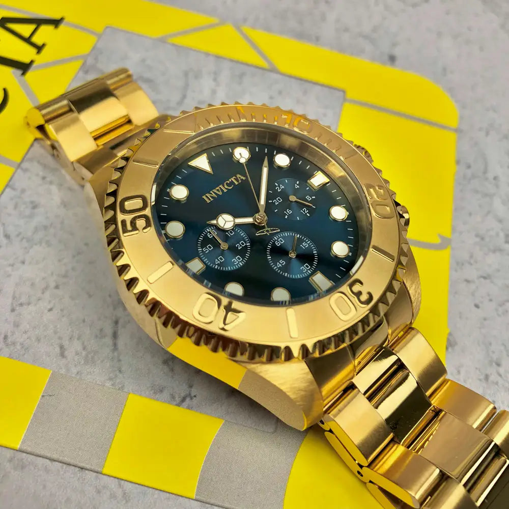 Este Grand Diver de 47 mm en dorado y azul transmite lujo, profundidad y estilo. Un diseño pensado para quienes disfrutan de relojes con gran carácter y terminados brillantes que no pasan desapercibidos.