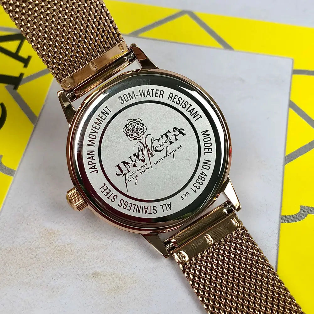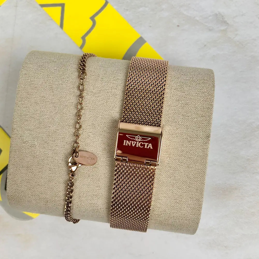 🌸 Un accesorio que ilumina cada movimiento. El Invicta Wildflower Rosé combina delicadeza y estilo en un diseño que transmite feminidad moderna. Su tono oro rosado y pulsera incluida hacen de este set un detalle irresistible para quienes disfrutan marcar la diferencia con elegancia sutil.