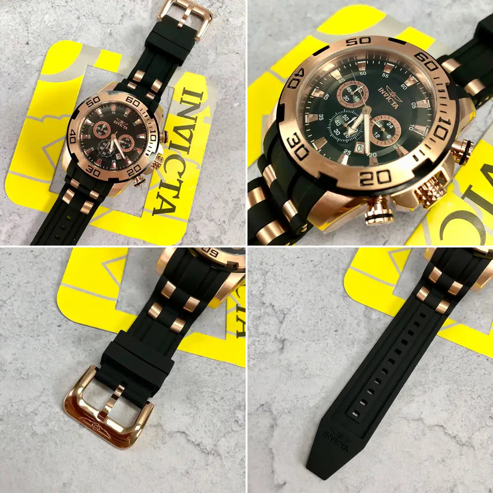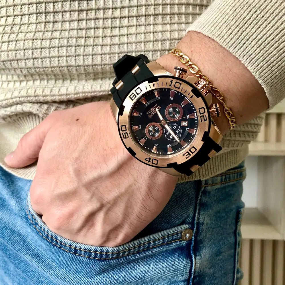 El Invicta Pro Diver 33939 combina robustez con un brillo sofisticado. Su tono oro rosa impone carácter sin perder elegancia, perfecto para quienes dominan con estilo cada momento.