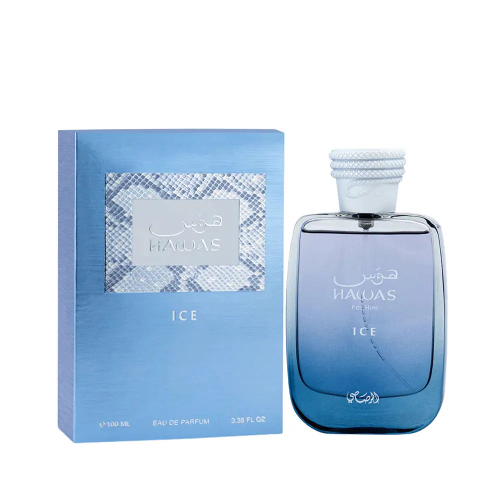 Rasasi Hawas Ice Eau de Parfum es frescura helada con presencia masculina. Un aroma limpio, acuático y especiado que transmite elegancia casual y seguridad sin esfuerzo.